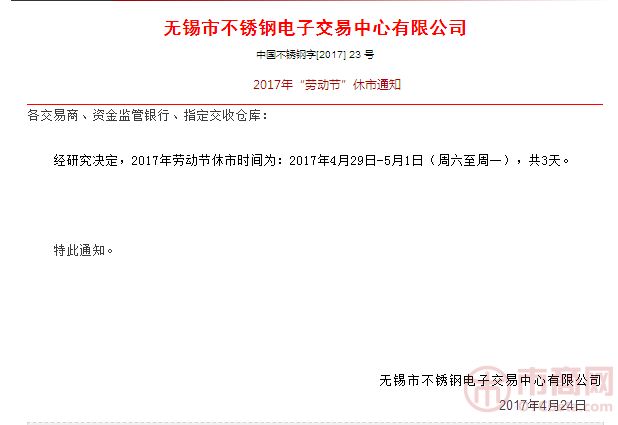 行業(yè)資訊 當前位置:首頁>>信息中心>>行業(yè)資訊 無錫市不銹鋼電子交易中心發(fā)布2017年“勞動節(jié)”休市通知 時間:2019-06-13 作者:無錫不銹鋼板 瀏覽:0 2017年4月24日無錫市不銹鋼電子交易中心官網發(fā)布2017年“勞動節(jié)”休市通知,4月29日至5月1日共3天休市。 原文如下: 2017年“勞動節(jié)”休市通知 上一篇:無錫漢能不銹鋼:4月27日無錫不銹鋼市場參考價 下一篇:2017年全球鎳需求料增至211萬噸